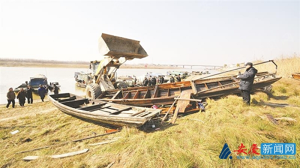 1月26日上午,安庆市大观区渔政执法人员在长江皖河口许家小圩段,组织已签协议的渔船安全有序拆解。