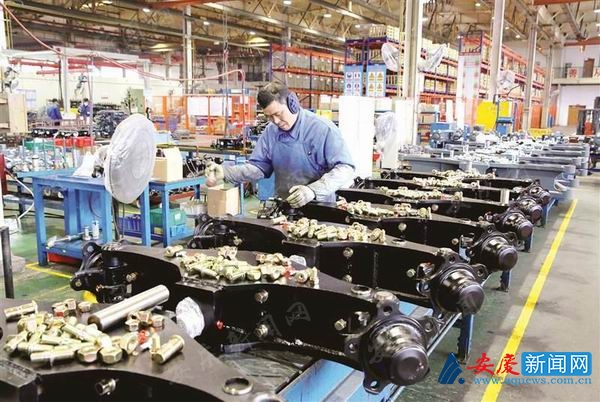 2月14日,在经开区安徽合力股份有限公司安庆车桥厂生产车间,工人们在装配出口美国的车桥总成。春节假期过后,我市众多企业开足马力复工生产,车间里一派繁忙景象。