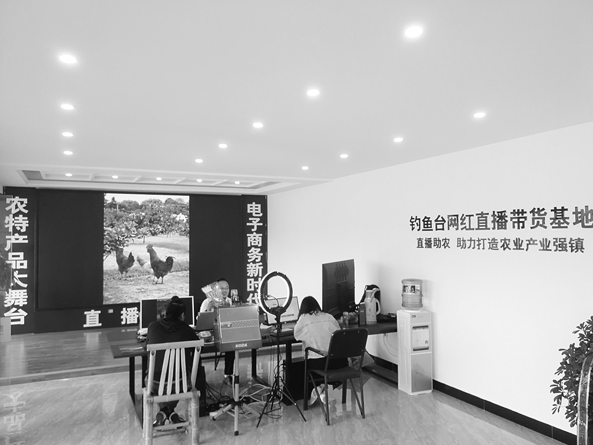 11月8日,网络主播正在网上推介当地农特产品。宿松县陈汉乡以农业产业强镇建设为契机,建立钓鱼台网红直播带货基地并开业直播,打造“互联网+农产品”营销模式,带动乡村旅游和农业、服务业发展。