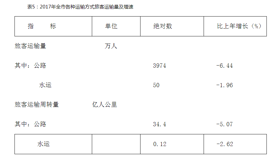 全年公路运输客运量为3974万人次,同比下降6.44%;完成旅客周转量为34.4亿人公里,同比下降5.07%。完成公路货运量13775万吨,同比上涨16.37%;完成货物周转量为203.0亿吨公里,同比上涨5.33%。全年水路共完成旅客运输50万人次,同比下降1.96%;完成旅客周转量1188万人公里,同比下降2.62%。完成货运量4020万吨,同比增长6.80%;货物周转量255.7亿吨公里,同比增长14.47%。安庆港2017年完成货物吞吐量2401万吨,同比增长5%。全市民航机场旅客吞吐量45.9万人次,同比增长41%。