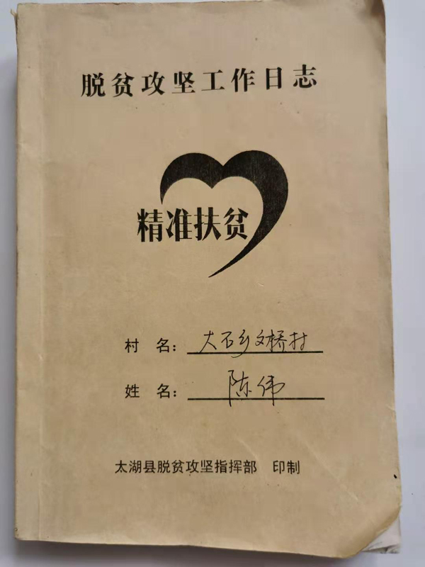 图片内容:安徽省地方海事(港航)管理服务中心驻大石乡文桥村扶贫工作队副队长陈伟同志扶贫日志,详细记录了陈伟同志驻村帮扶工作开展以来,在2017年7月至2018年5月期间日常工作中遇到的大小故事,记录了他用心帮扶的经历。