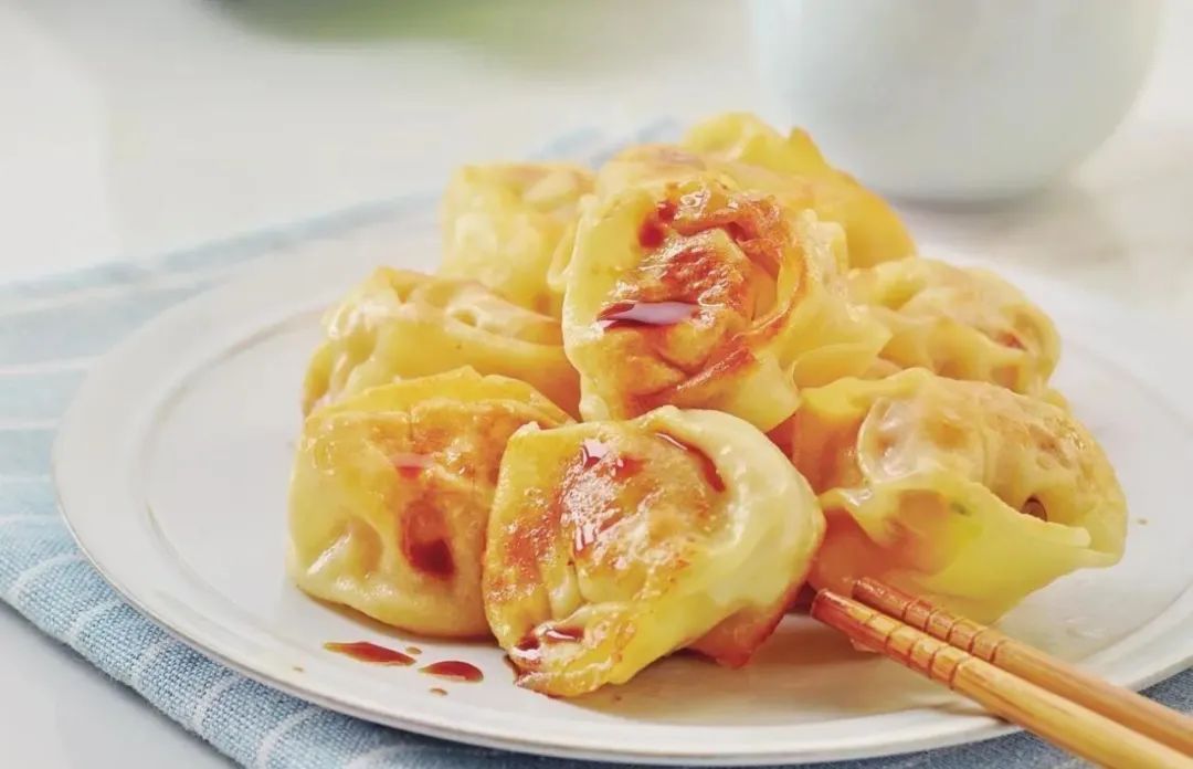 小贴士:煎好馄饨后加水不必太多,没过馄饨的1/3 处即可。加水是为了使馅料成熟。水收干后转小火将馄饨烙脆,还可以再滴几滴油,效果更好。