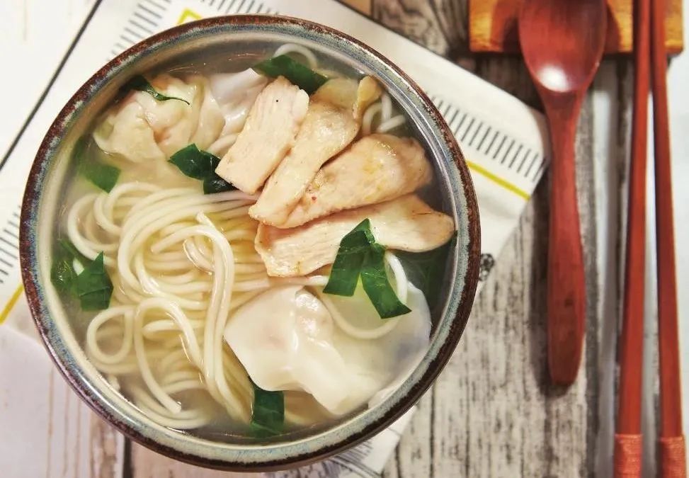 准备材料:细面条200 克,鸡肉200 克,馄饨10 个,青菜适量,胡椒粉4 克,盐适量,香油适量