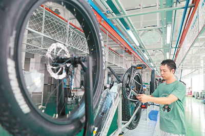江西省九江经济技术开发区九江驰畅车业有限公司生产车间内,工人正在组装销往欧美市场的新能源助力自行车。