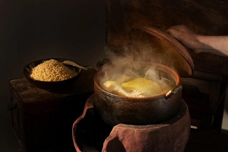 人们准备好新鲜猪肉,洗得干干净净,抹上粗盐、酱油,围在大缸里腌制一整夜。阳光温暖时再取出,挂在高架上晾晒、风干。一串串腊肉、腊肠闪着油光,在寒风与时光里,变浓变香,变成冬日里那碗腊味饭。