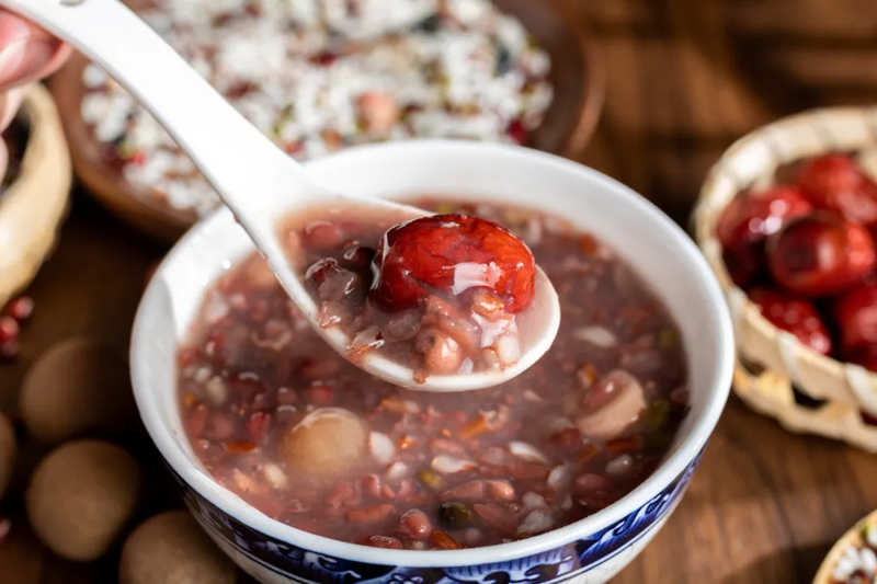 《燕京岁时记》中记载:“腊八粥者,用黄米、白米、江米、小米、菱角米、栗子、红豇豆、去皮枣泥等,合水煮熟,外用染红桃仁、杏仁、瓜子、花生、榛穰、松子及白糖、红糖、琐琐葡萄,以作点染。”