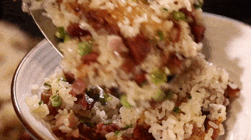 刚蒸好的糯米饭每一粒都油亮油亮的,和红豆,腊肠,玉米,肉丁等密密麻麻挨在一块,五颜六色的,好看的不得了。舀一大勺放进嘴里,又黏又糯,吞下去仿佛能把寒气全都堵住,一点儿风也灌不进来,整个小肚皮都暖烘烘的。