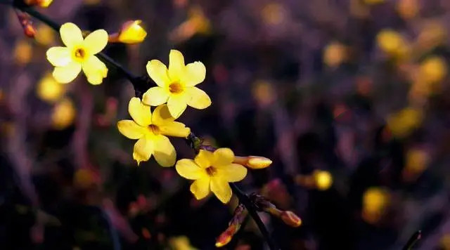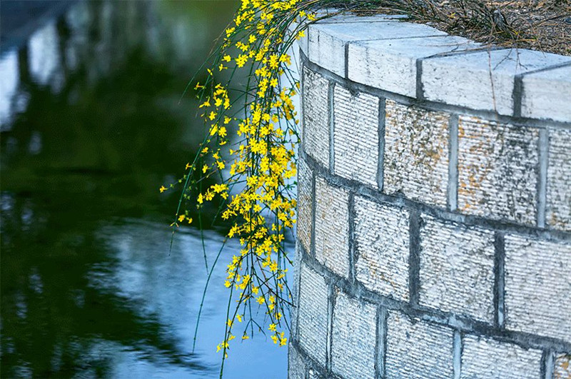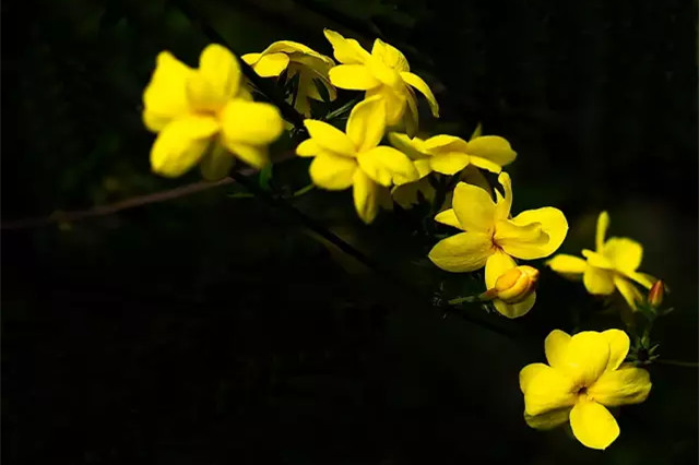 冬末初春时,在湖边溪畔、山野石缝间,便有迎春花细长的枝条重重叠叠披垂下来。
