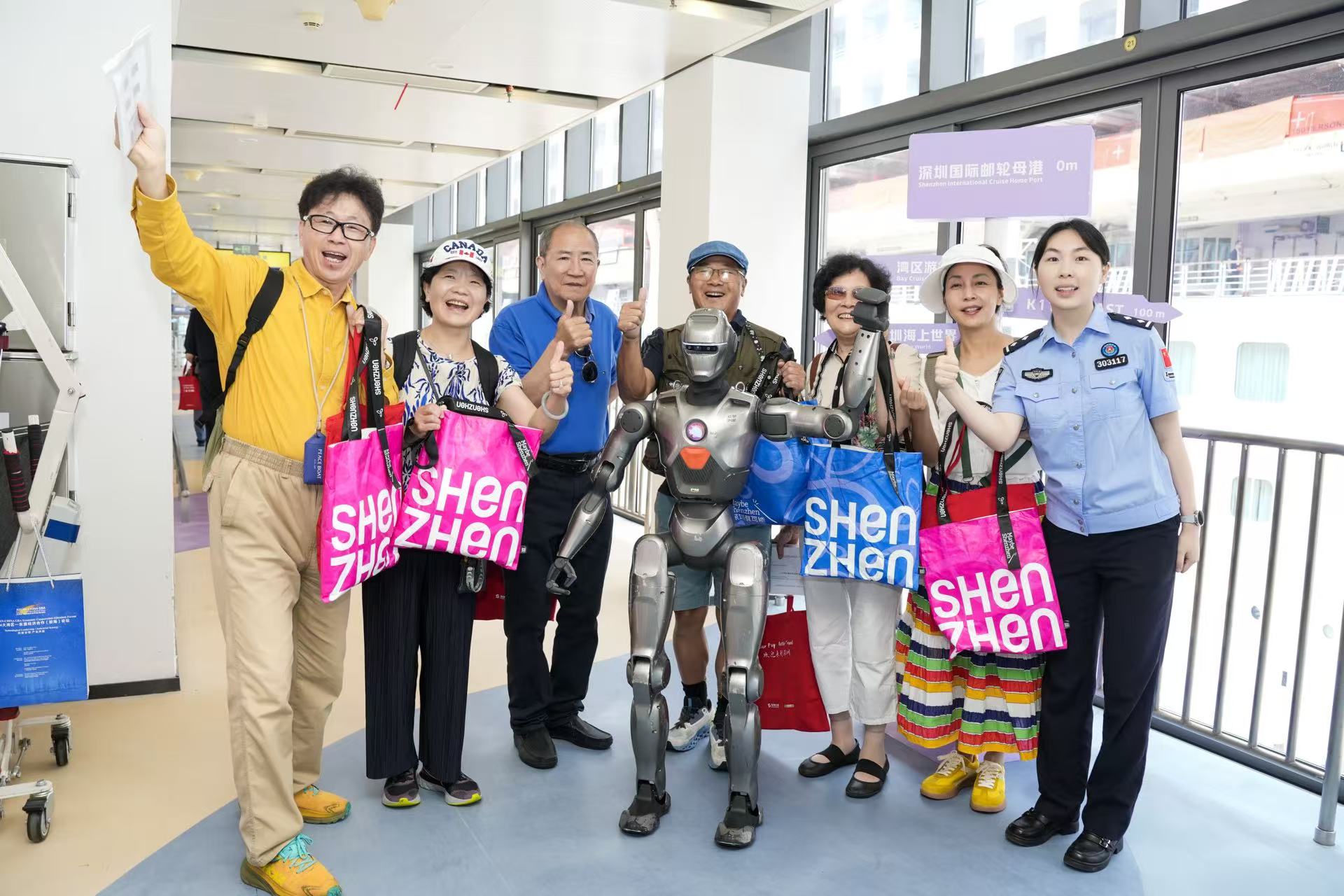 4月28日,深圳派出人形机器人欢迎2000多名邮轮入境游客。 招商邮轮母港 供图