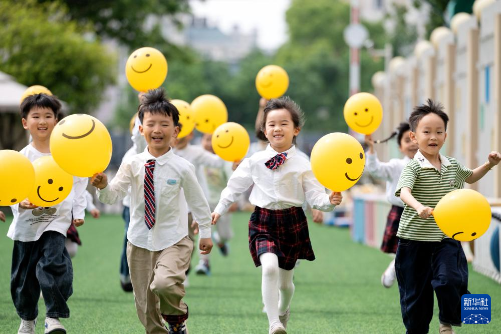 5月6日,浙江省湖州市长兴县实验幼儿园的孩子们手举笑脸气球,进行“笑脸赛跑”小游戏。新华社发(谭云俸摄)
