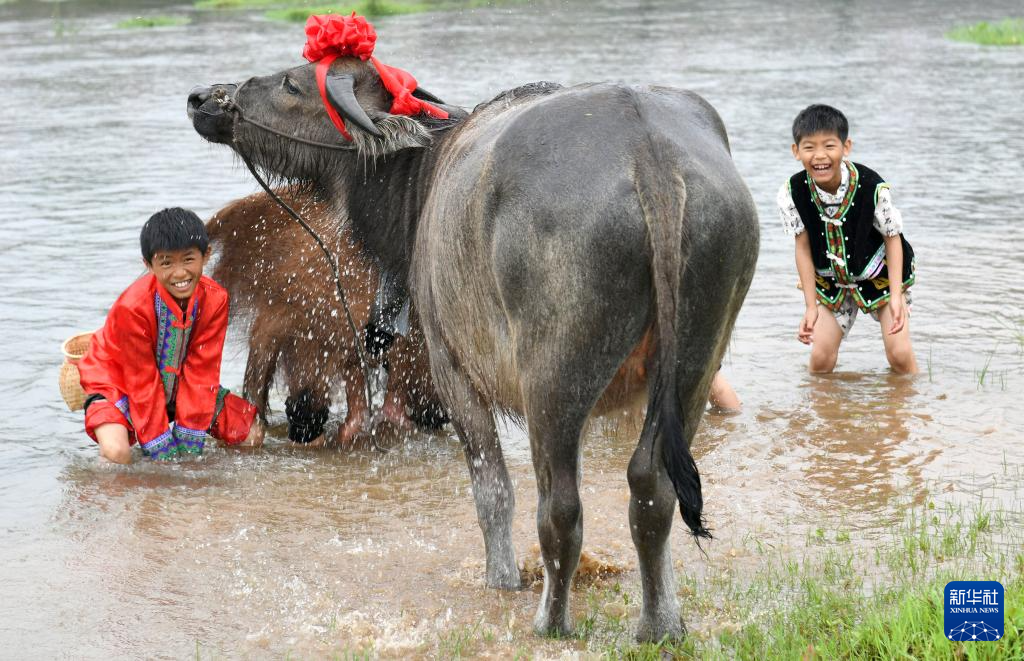 5月5日,在广东省清远市连山壮族瑶族自治县上帅镇东君村,身着壮族服饰的小朋友在中洲河里沐牛。新华社发(许建梅摄)