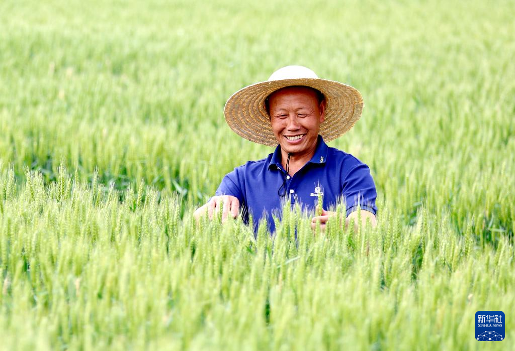 5月5日,山东省临沂市郯城县郯城街道陵坡村村民在田间查看小麦长势。新华社发(张春雷摄)
