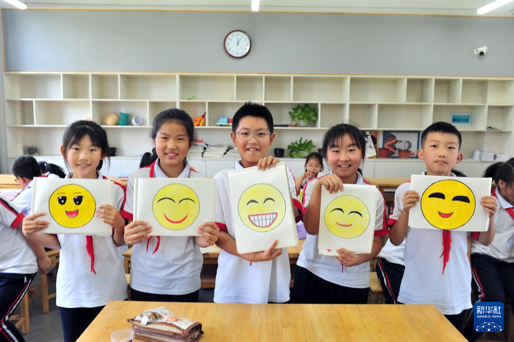 5月7日,湖北省宜昌市秭归县实验小学学生在美术课堂上展示自己创作的笑脸卡通美术作品。新华社发(王辉富摄)