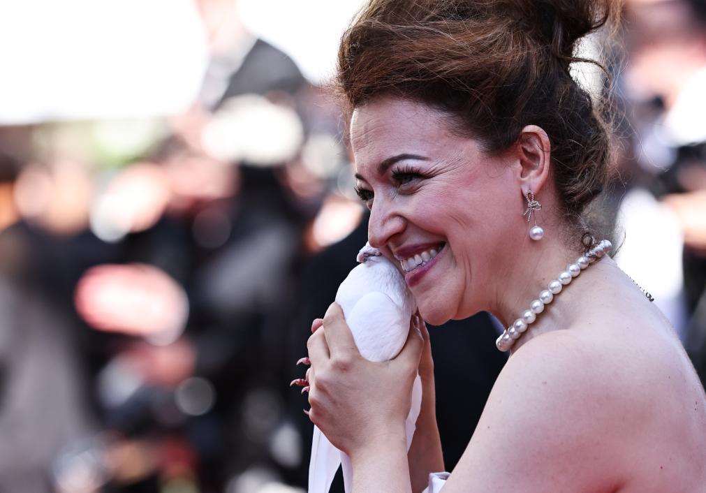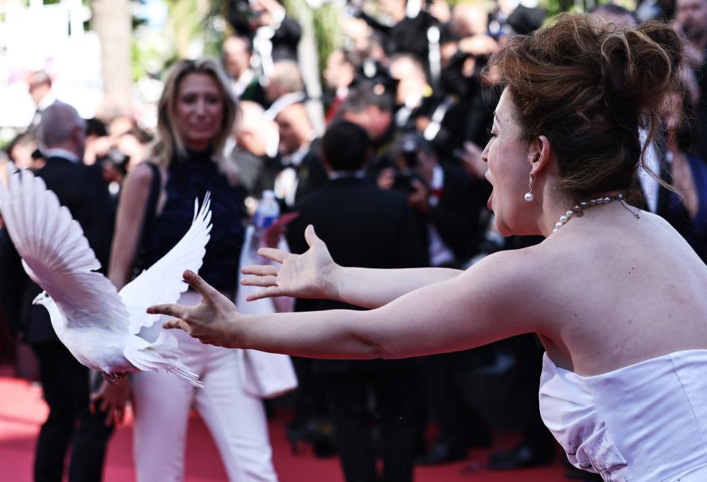 5月15日,在法国戛纳举行的第78届戛纳国际电影节上,一名嘉宾带着鸽子亮相主竞赛单元影片《137号事件》首映礼。新华社记者 高静 摄