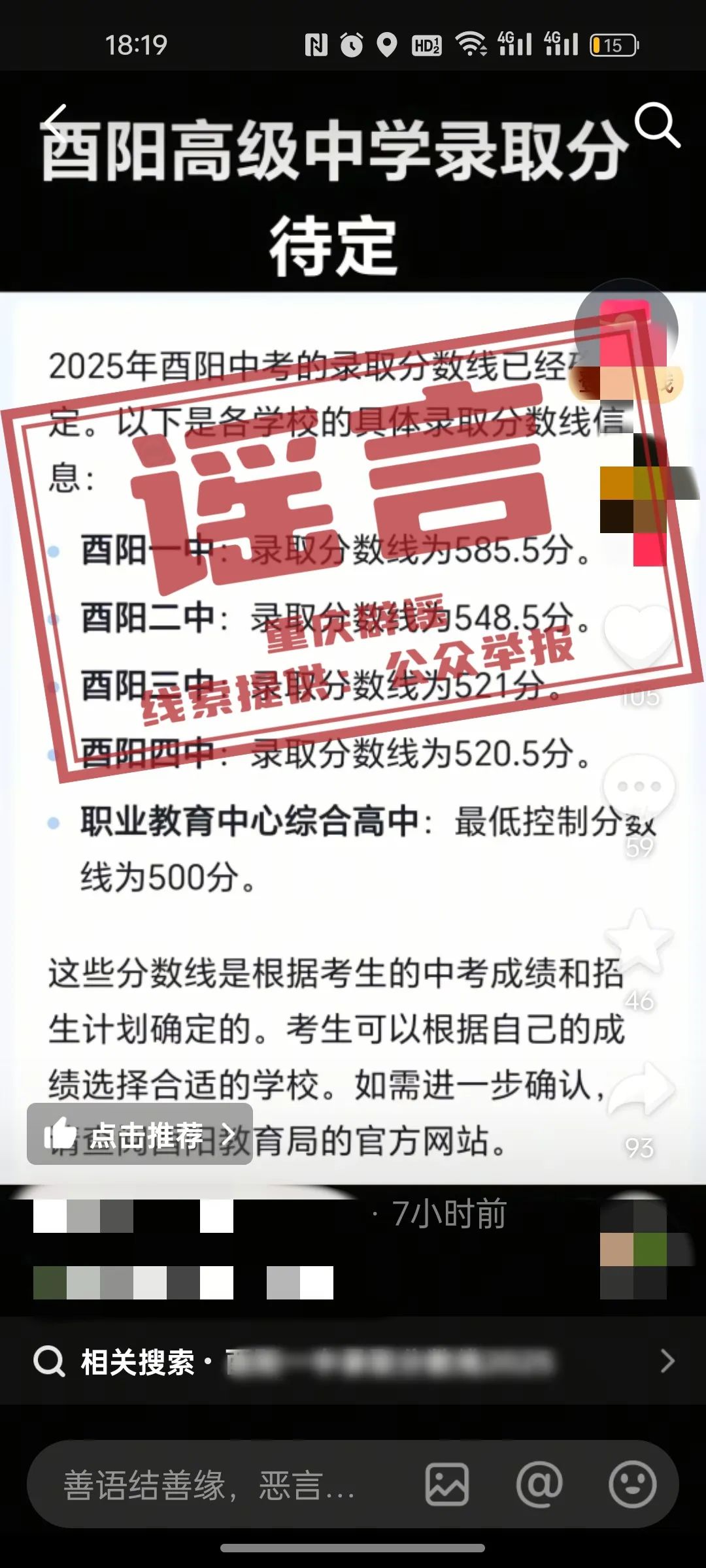 2025重庆酉阳中考录取分数线已确定?官方回应