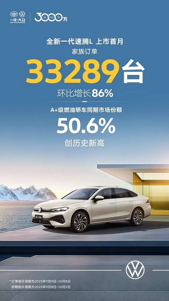 一汽-大众发布数据显示,全新一代速腾L上市首月,速腾家族销量达33289辆,环比增长86%,占据A+级燃油轿车同期市场份额50.6%,创历史新高。