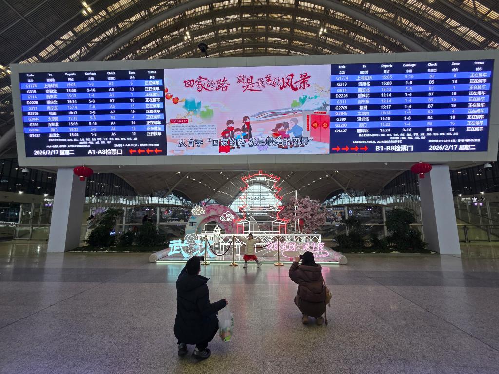 2月17日,高铁武汉站内,父母给小朋友拍照。新华社记者汪平 摄