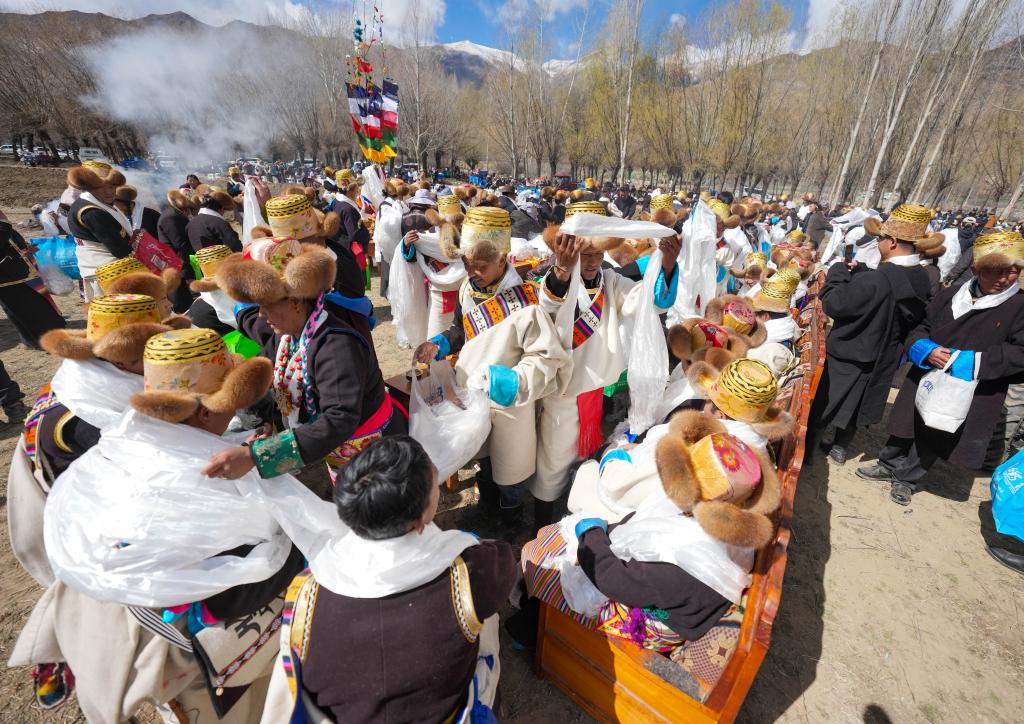 62岁的村民桑吉头顶黑色礼帽,身着氆氇藏装,跟乡亲们聊着天。他说,尽管外出务工的收入比务农高,但春耕仪式当天,年轻人都会赶回村里参加,祈愿风调雨顺、五谷丰登。