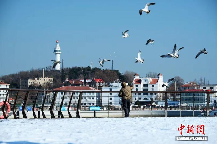 山东半岛北部迎“冷流降雪” 海滨城市引游客赏雪听涛